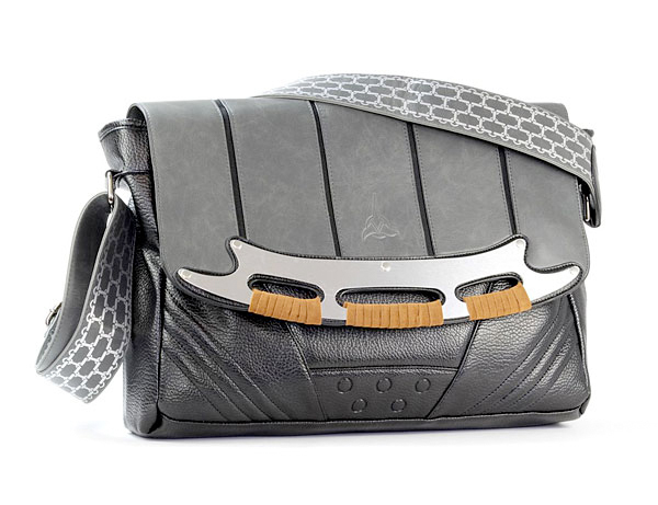 First up, there's a Klingon messenger bag with a shoulder strap that looks like Worf's sash from Star Trek: The Next Generation and a magnetic closure flap resembling a Bat'leth with suede grips and a Klingon symbol. There's plenty of organizing pockets inside to keep everything in its place.