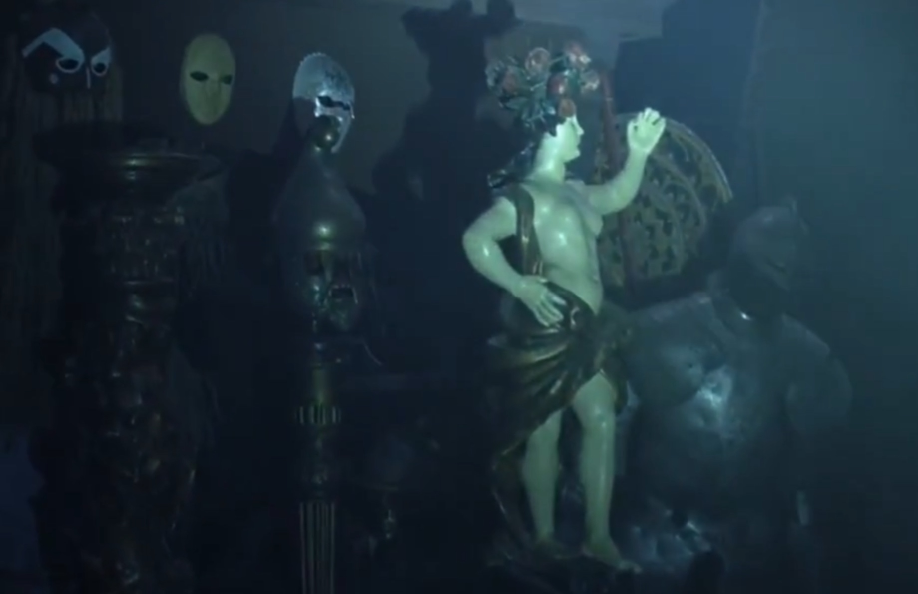 Please excuse the white blocks censoring the nudity, as we aren't allowed to share that kind of content on this site. But notice the red curtains, candelabras, and the stone walls. Not only is there a similar look going on here, the fancy brothel feels unlike anything we've seen inside Westworld thus far. Is it possible that Medieval World once existed on this plot of land, and after the critical failure, the remnants have been repurposed in a Westworld expansion? This is something that happens in the real-life theme park world all the time. The hosts painted gold could be repurposed from a former Roman World narrative.