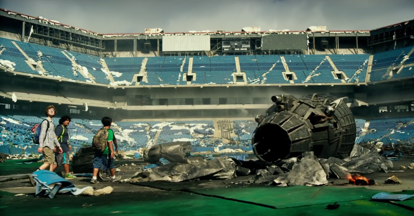 A wide shot of a football stadium shows a gaping hole in the side of it, and there's debris like this everywhere. Is this where a Transformer ended up after being blasted out of the sky in Transformers: Age of Extinction? Since there is still some smoke and fire lingering, this looks like something that just happened moments ago, but what caused this destruction? That appears to be a jet engine there in the middle, so maybe it's a plane crash that will have more visual effects put in later?