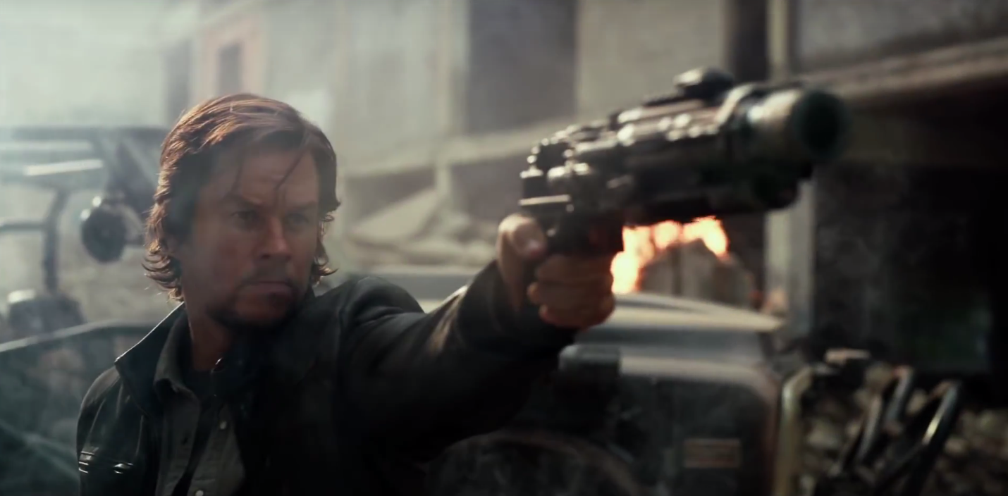 Mark Wahlberg has a brand new gun that he's wielding like a boss. This appears to be a confrontation before the Transformers Reaction Force actually apprehends him, or maybe it's after and instead of getting apprehended he gets away with the help of a certain yellow Autobot.