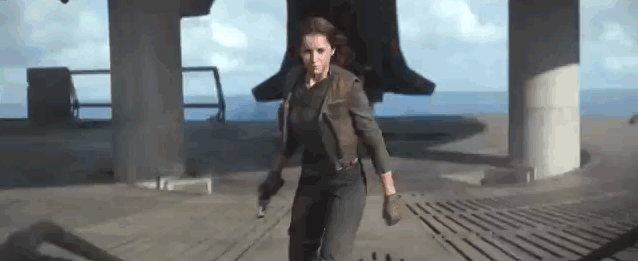 In the behind-the-scenes sizzle reel, we see Jyn, again with Death Star plans in hand, running through the beach turned war zone. Cassian can also be seen in the frame.