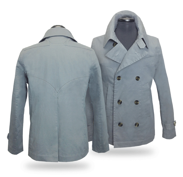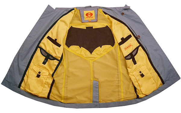 The Batman symbol is subtly stitched into the back of this seam light peacoat and not so subtly on the inside.