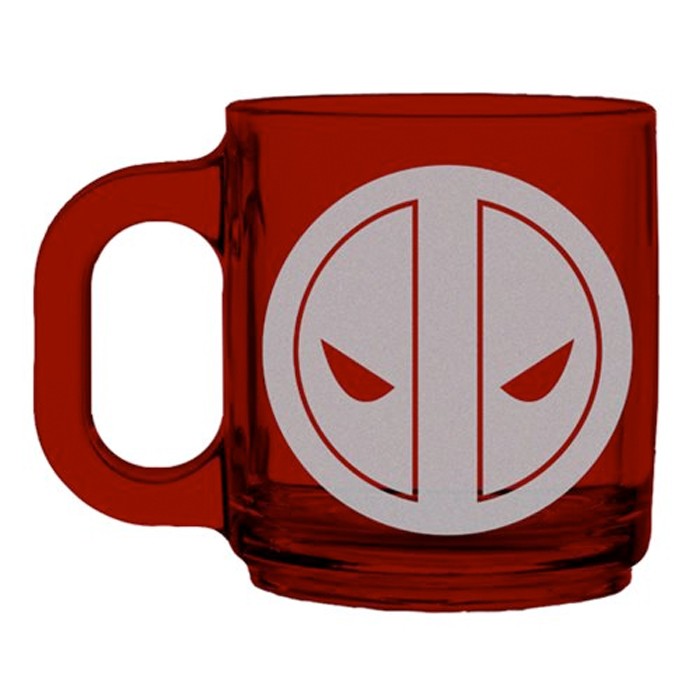 Put your lips right on the Merc with a Mouth, just how he likes it, with this red Deadpool logo etched glass mug.