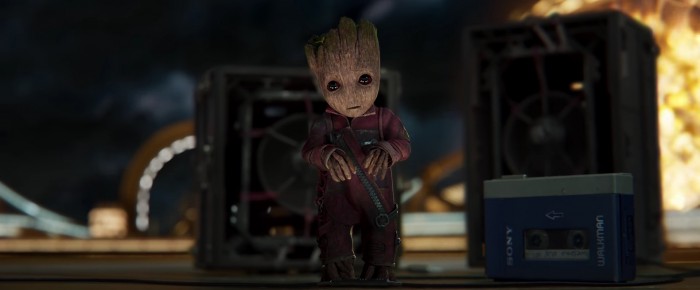 But wait, it gets better! Groot is the one who plugs Star-Lord's Walkman into the amp, thus setting the tone for the rest of the trailer. Mind you, this seems to be going on while the battle above is still raging. Groot knows how crucial a good soundtrack in helping to get shit done. Once again, the soundtrack is Fleetwood Mac's "The Chain."
