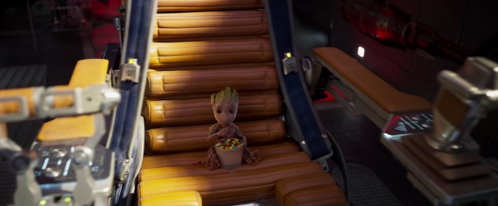 Groot is eating candy out of what might be the same pot he was dancing in one movie ago. I wonder if that's the same candy advertised on Star-Lord's light blue shirt — during Peter's visit to the set, Chris Pratt revealed that indecipherable alien language on his chest was advertising a made-up brand of space candy. Anyway, Groot does not listen to Star-Lord's warning.