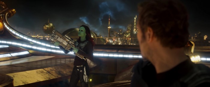 You see, Peter's none too pleased with Gamora's new weapon of choice. "Is that a rifle?" he asks. Her retort: "You don't know what a rifle looks like?"