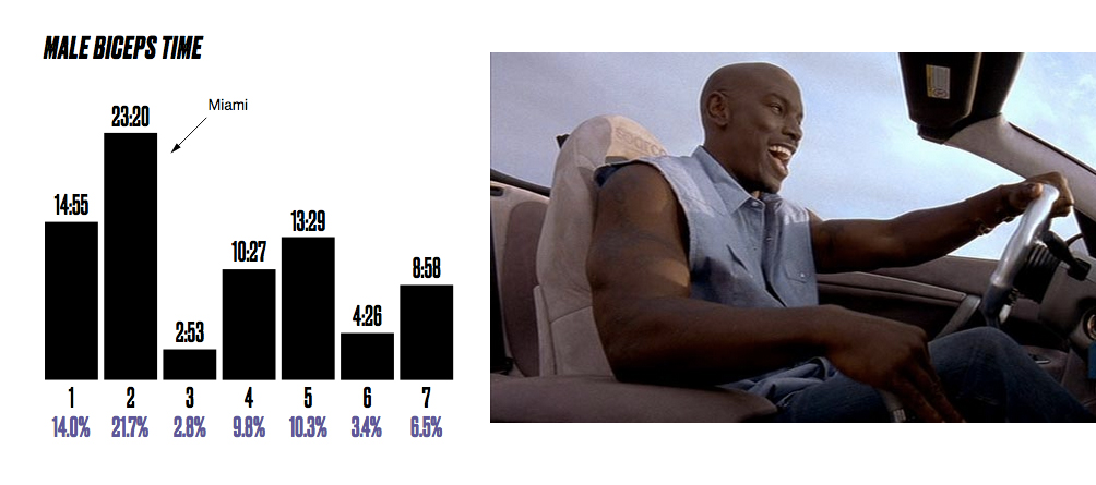 It's also funny to see just how much screentime has exposed male biceps compared to how much of a focus there is on female butts. Then again, it only makes sense that there are more biceps since it's perfectly normal to see sleeveless shirts among Dominic Toretto and his crew, but it's not really practical for the camera to show the backside of ladies anywhere near as frequently. If you want that, then you'll have to watch a much different movie.