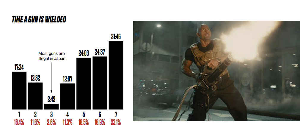 With the eighth movie in the Fast and Furious franchise arriving this weekend, we'll get all-new sequences of ridiculous action, explosions and uses of the word family. Those are just some of the things you can expect from each and every film in the franchise, and the folks at Bloomberg decided to fiercely crunch the numbers for all of the seven previous movies leading up to The Fate of the Furious. The result is a plethora of infographics counting everything from how many shots there are of odometers/tachometers to how much screentime is given to female butts.