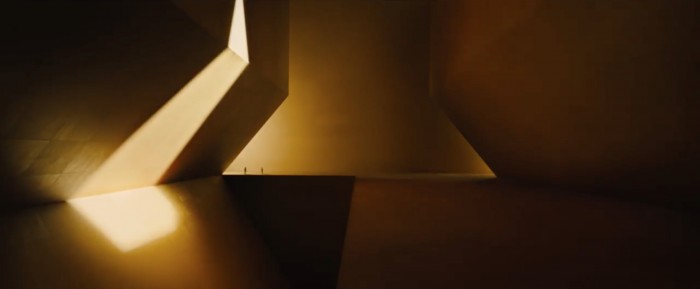 While the streets of Los Angeles are grimy and filthy and bathed in neon, the interiors of the buildings belonging to the wealthy and the powerful and as austere and menacing as ever. As we will soon see, this building seems to house a company that creates replicants (robots who look like humans, live a very short lifespan, and exist to take on manual labor and other jobs people do not want). Rather appropriately, this looks like a temple – this a space built for gods, not for men.