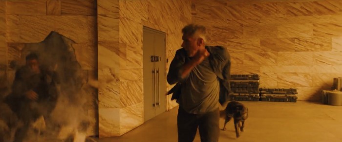 However, two things are made clear very quickly. First of all, the men who follow Officer K to Deckard's hotel are clearly replicants, as they can smash through thick stone walls with ease. But more importantly, it looks like lonely 'ol Deckard has a little doggie buddy! Aww.