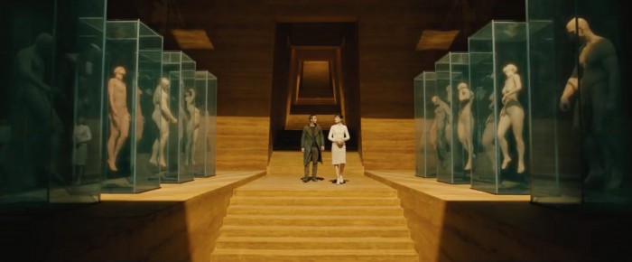 And here we find Ryan Gosling's Agent K escorted down a lengthy stairwell, past display cases filled with replicant bodies. These bodies appear to be templates of sorts, lacking the details needed to sell them as human beings. It's an upsetting image – they're close enough to human to look real at a glance but treated as mere props for a hallway.