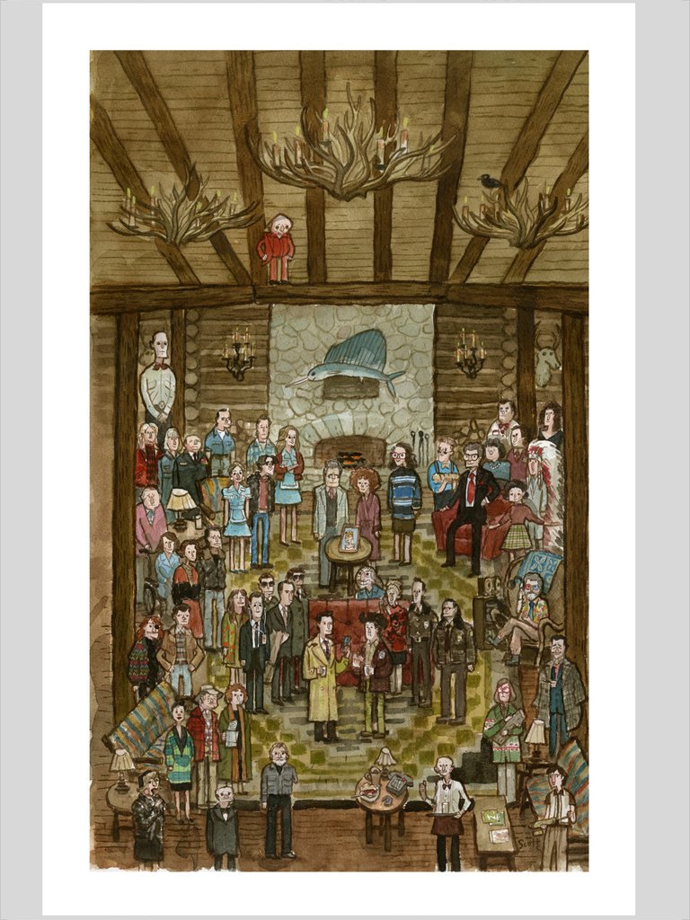 It's hard to believe, but more than 25 years after David Lynch and Mark Frost's surreal, influential TV series Twin Peaks went off the air, we're about to head back to the town that started it all with a batch of brand new episodes on Showtime later this month. But before we do that, artist Scott C. is here to celebrate the original episodes of the show with a new art print called "In the Warmth of the Great Northern," which features nearly every major character we've seen thus far gathered in the lobby of the show's famous hotel.