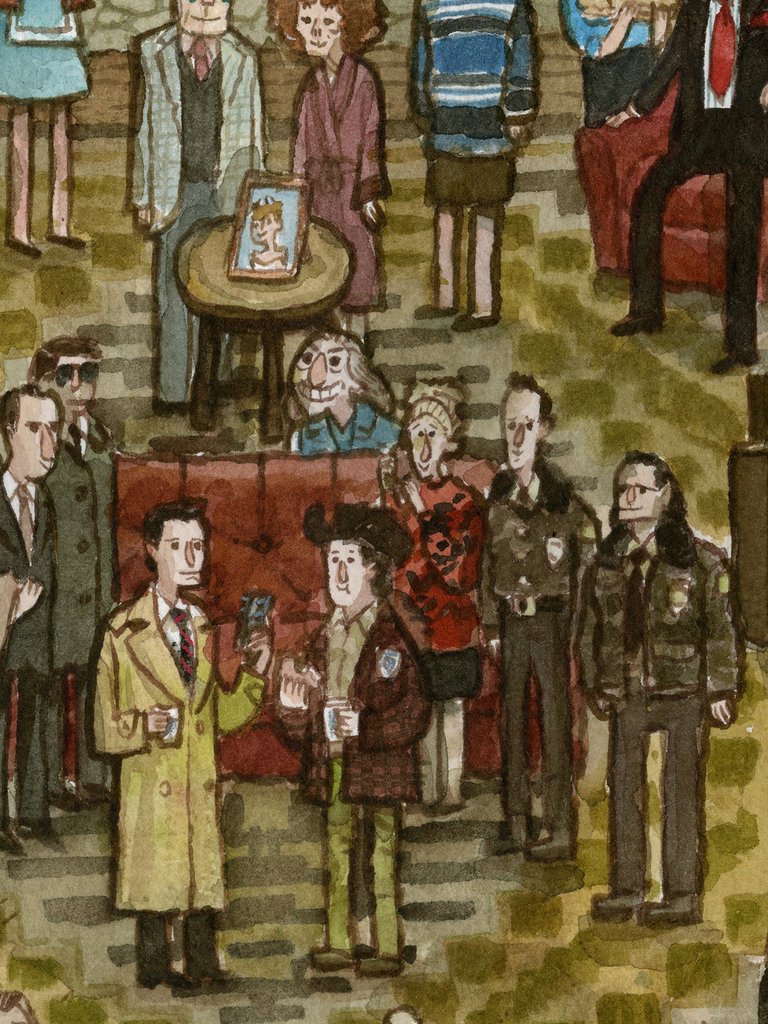 The gang's all here, and as you might expect the whole crowd forms a circle around a framed photo of Laura Palmer, the murdered girl who's found wrapped in plastic in the pilot and kicks off the mystery that sustains the whole first season (and a little of the season 2). Radiating outwards from Laura's picture are groups of family units: literal ones like the Palmers, the Haywards, and the Hornes; and metaphorical ones like the law enforcement groups near the bottom center, like the FBI agents (including FBI Special Agent Dale Cooper) and the local Twin Peaks law enforcement (including Sheriff Harry S. Truman).