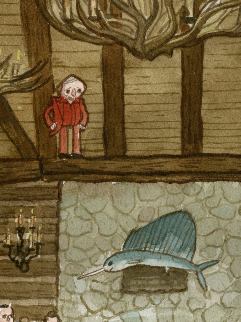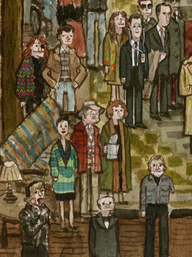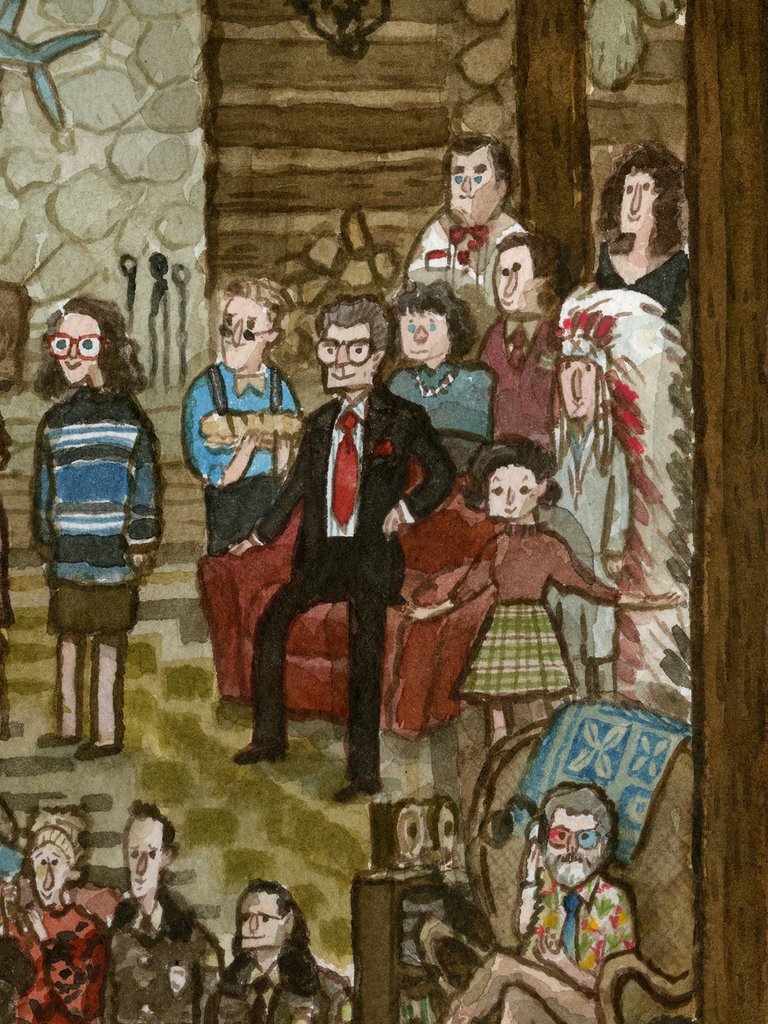 Twin Peaks ran the gamut from procedural thriller to psychological horror, but the Great Northern Hotel always seemed like a place of warmth and community, so it's a perfect setting for this painting. Of course, there are some key players encroaching on in the fringes here, like the Giant (top left), The Man From Another Place (top center), and the murderous Bob (hiding in plain sight behind the couch just below Laura's picture), all mirroring the way they intrude on the show's version of the "normal" world.