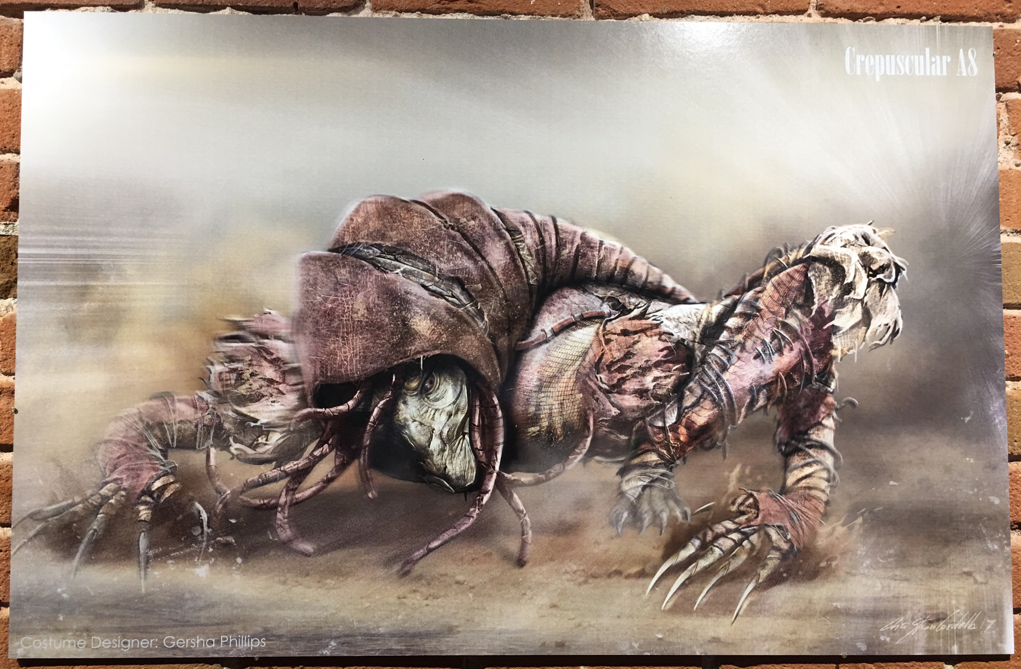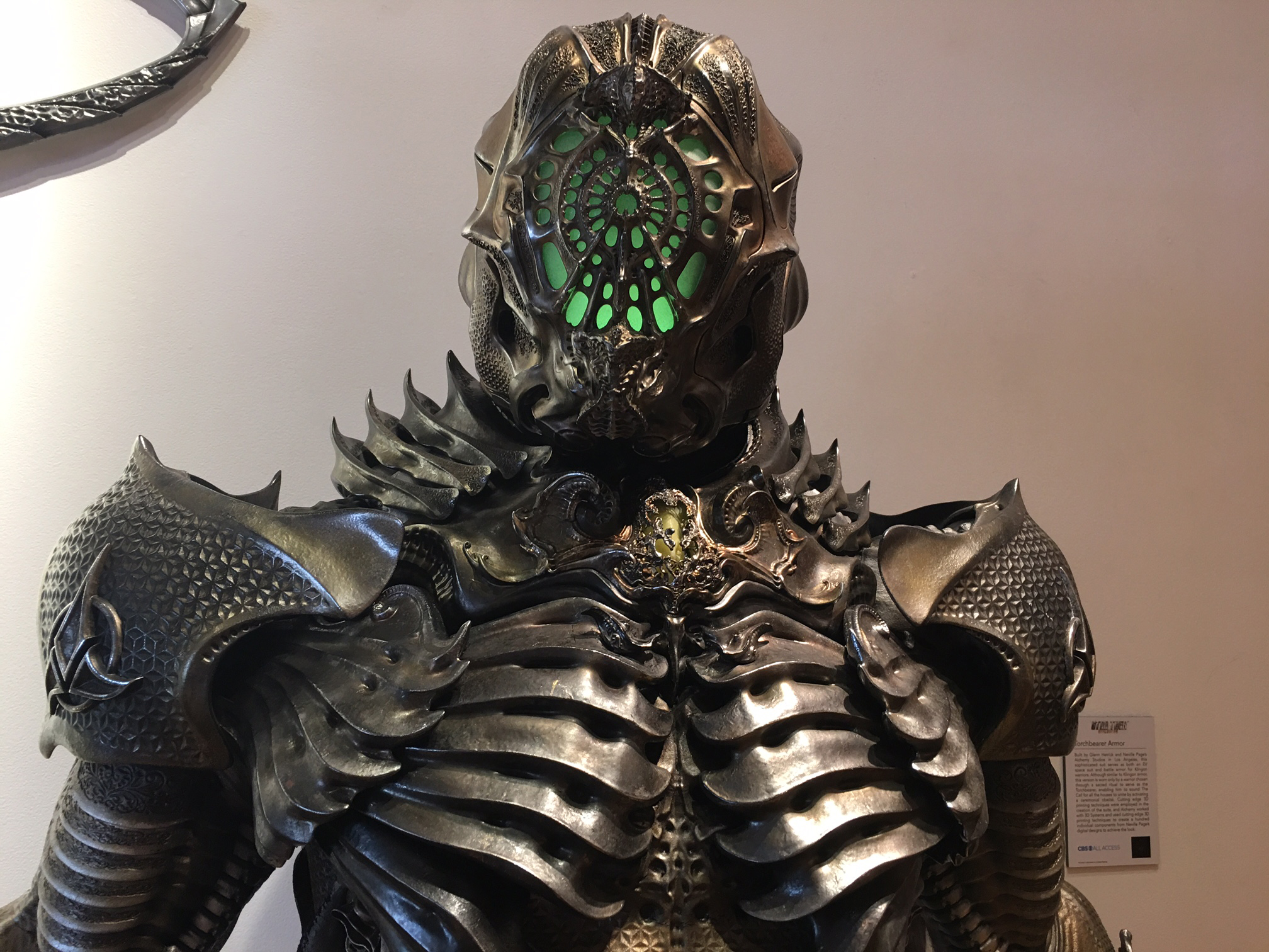 Built by Glen Hetrick and Neville Page's Alchemy Studios in Los Angeles, this is an example of a high-ranking officer's personalized helmet and collar. Each warrior's battle armor bears a unique signature look as a matter of honor. The full body armor suit and helmet can fully retract and extend from the collar itself by combining physical elements and VFX compositing in post-production.