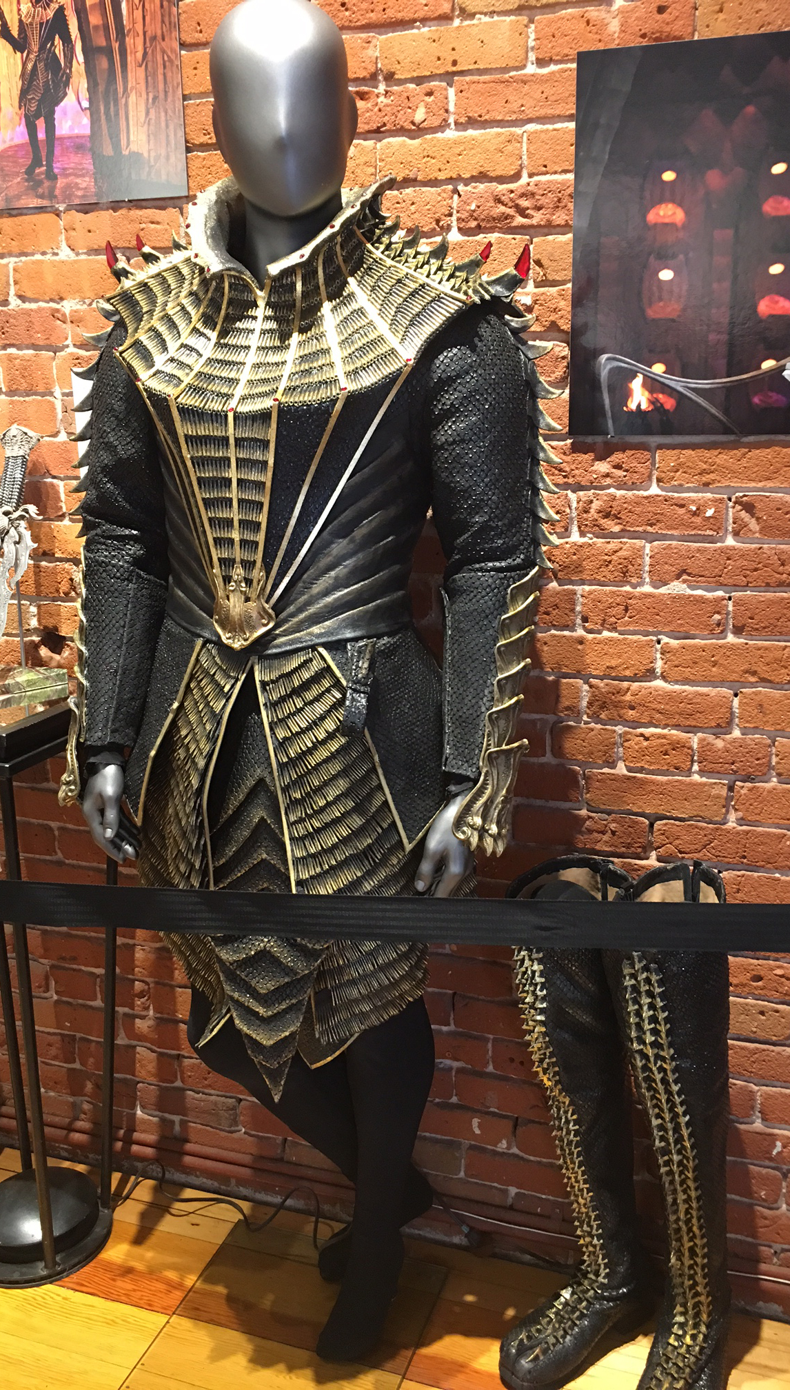 This House of T'Kuvma female Klingon uniform is representation of the style worn by the members and follows of the House. The warrior uniforms are painstakingly built piece-by-piece with hand-pressed leathers that are individually stained, painted, and molded for texture. This ornate costume is designed by Gersha Phillips and Suttirat Anne Larlarb and takes a team of 10 costumers an estimated 110 hours to create.