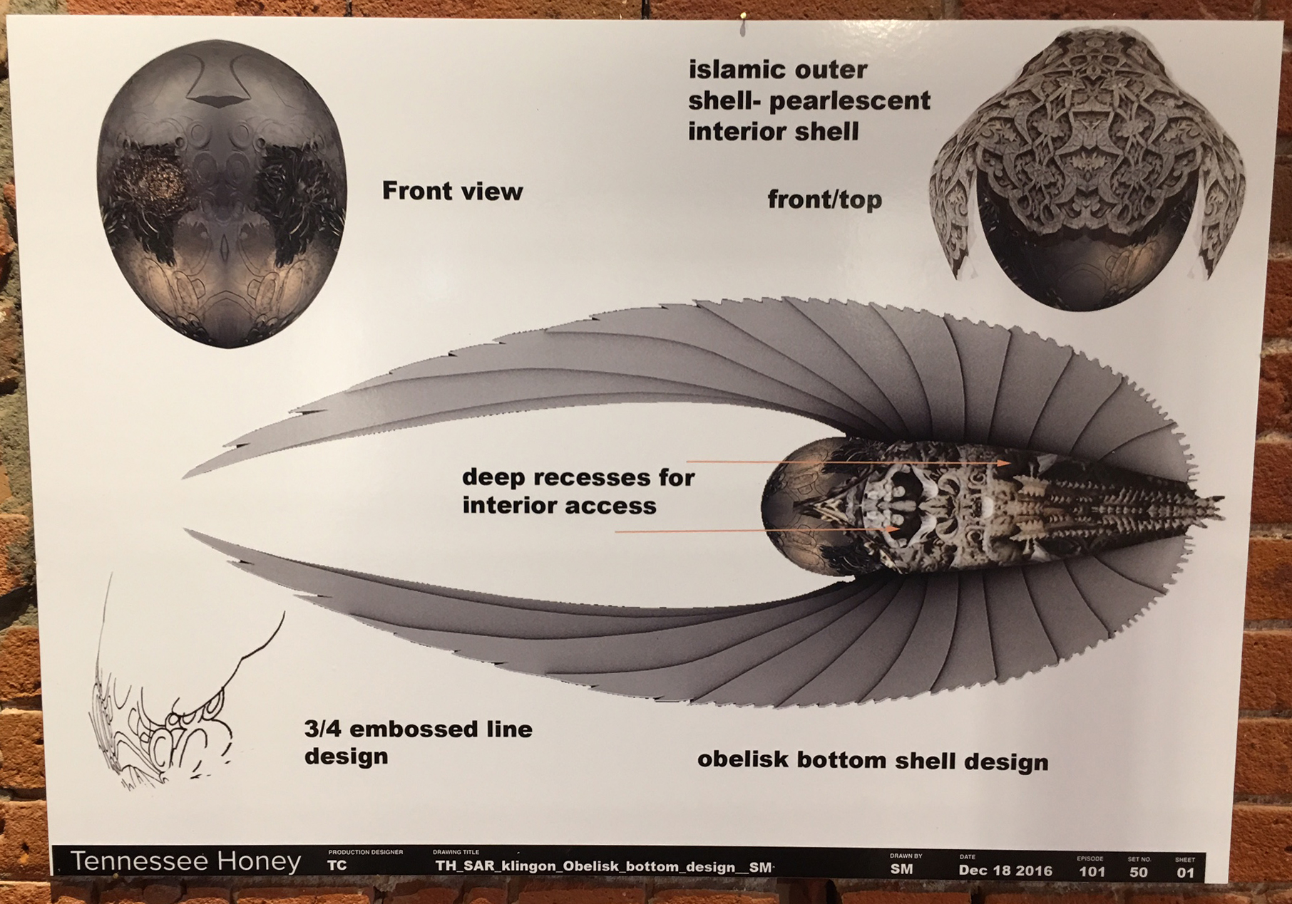 Built by Alchemy Studios, the periscopic helment is worn by Klingon pilots to provide a Heads Up Display of weapons systems, three-dimensional star system charts and other critical tactical information essential to controlling the ship's navigational and weapons systems. It was entirely 3D printed and painted using complex airbrush techniques that employ a combination of proprietary automotive paints, acrylics, and weathering layers.