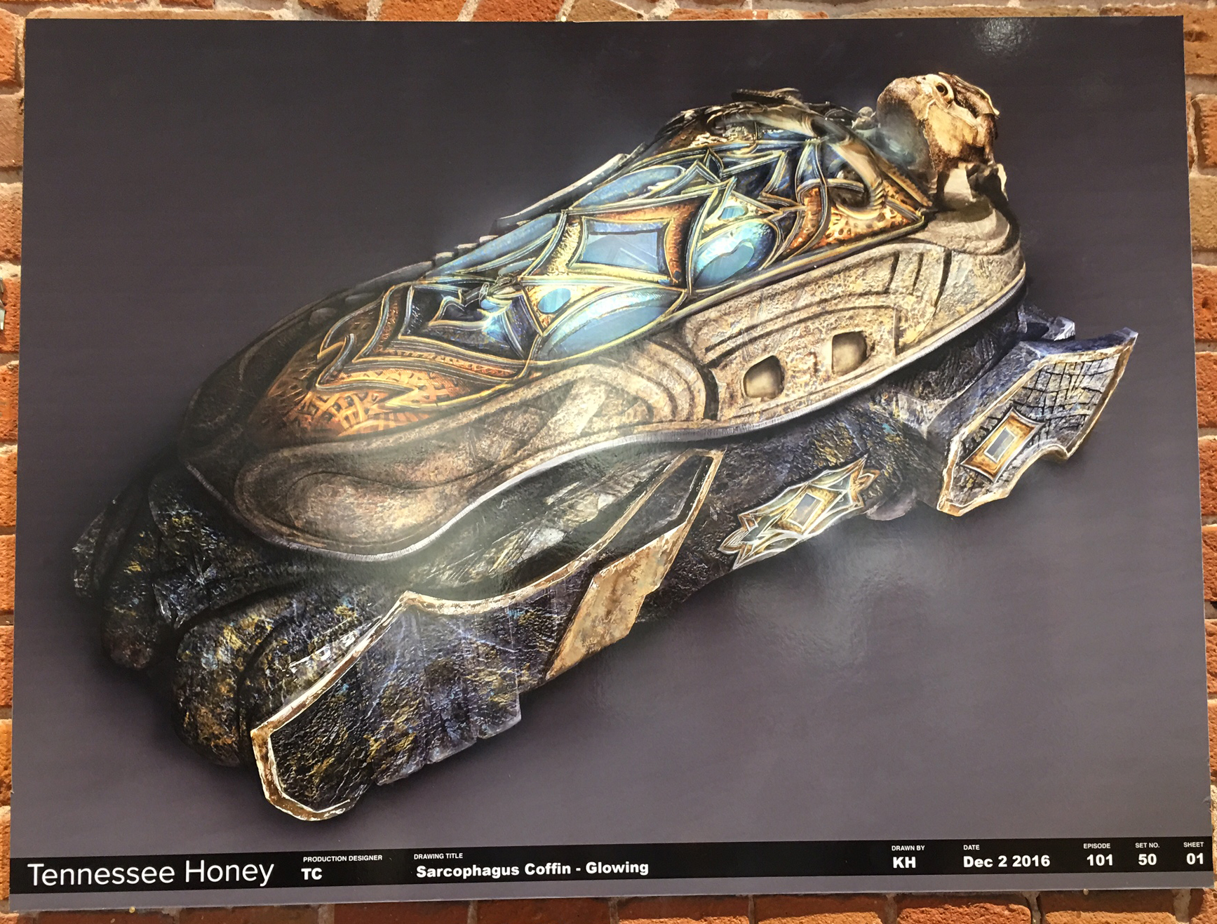 Built by Alchemy Studios, the ceremonial blades location on the boots of the Torchbearer's suit are ornate, reimagined versions of the classic and beloved Klingon weapons from Star Trek: The Next Generation and other Star Trek films and shows. The daggers, helmets, and full suits have embraced and augmented the cultural notes from Star Trek: The Original Series Klingons, employing a mixture of Middle Eastern, Mongolian, and Byzantine influences to achieve the Klingon aesthetic.