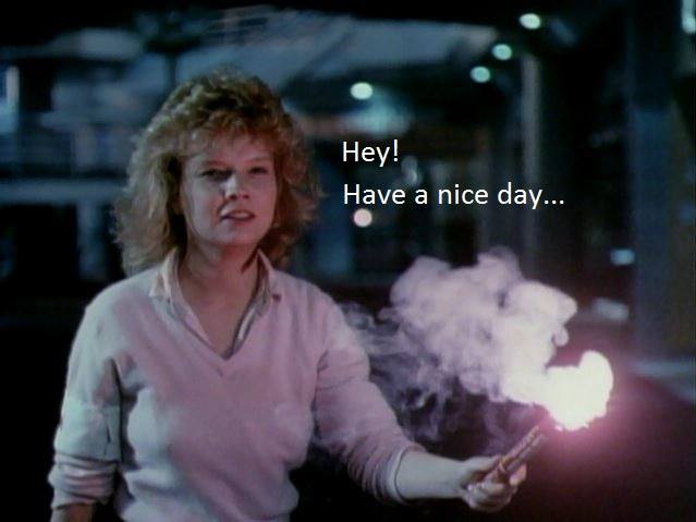 [Minutes after our call end, Maroney emailed me to say that she had forgotten to mention one very important thing that she learned about only after filming of Chopping Mall had ended. So I called her back up to uncover this key detail...]Kelli Maroney: Okay, so I noticed this when I first saw the screening of it, but it was kind of hoping that nobody else would notice it. But everybody notices it. One of the things that really upsets me about the movie is I go through the entire film with severe camel toe. I mean, severe camel toe. It's all you can look at!Blake J. Harris: Ha!Kelli Maroney: No one said a word to me during the shoot. Now, Jim Wynorski, I can understand why he wouldn't say that. But the costume lady? One of my friends? I mean, I watch the movie and all I can think is there's another camel toe shot! And it's not just me. You know, I was hoping: okay, I noticed that but nobody else is gonna notice that! No, it's all over the internet. The camel toe!Blake J. Harris: Quite an honor there, to be remembered for that.Kelli Maroney: So I just want everyone to know: I know. [laughs] I know. And not only that, but nobody told me. But can you believe that?Blake J. Harris: Why do you think they didn't tell you? They didn't notice or they would have felt uncomfortable?Kelli Maroney: I don't think anyone had time to notice? But nobody would have felt uncomfortable.. Maybe they liked it.Blake J. Harris: [laughs] Probably.Kelli Maroney: So that's my defining characteristic of the character?? It's like I based my whole character of Allison in Chopping Mall on the camel toe, but I didn't, I swear!!