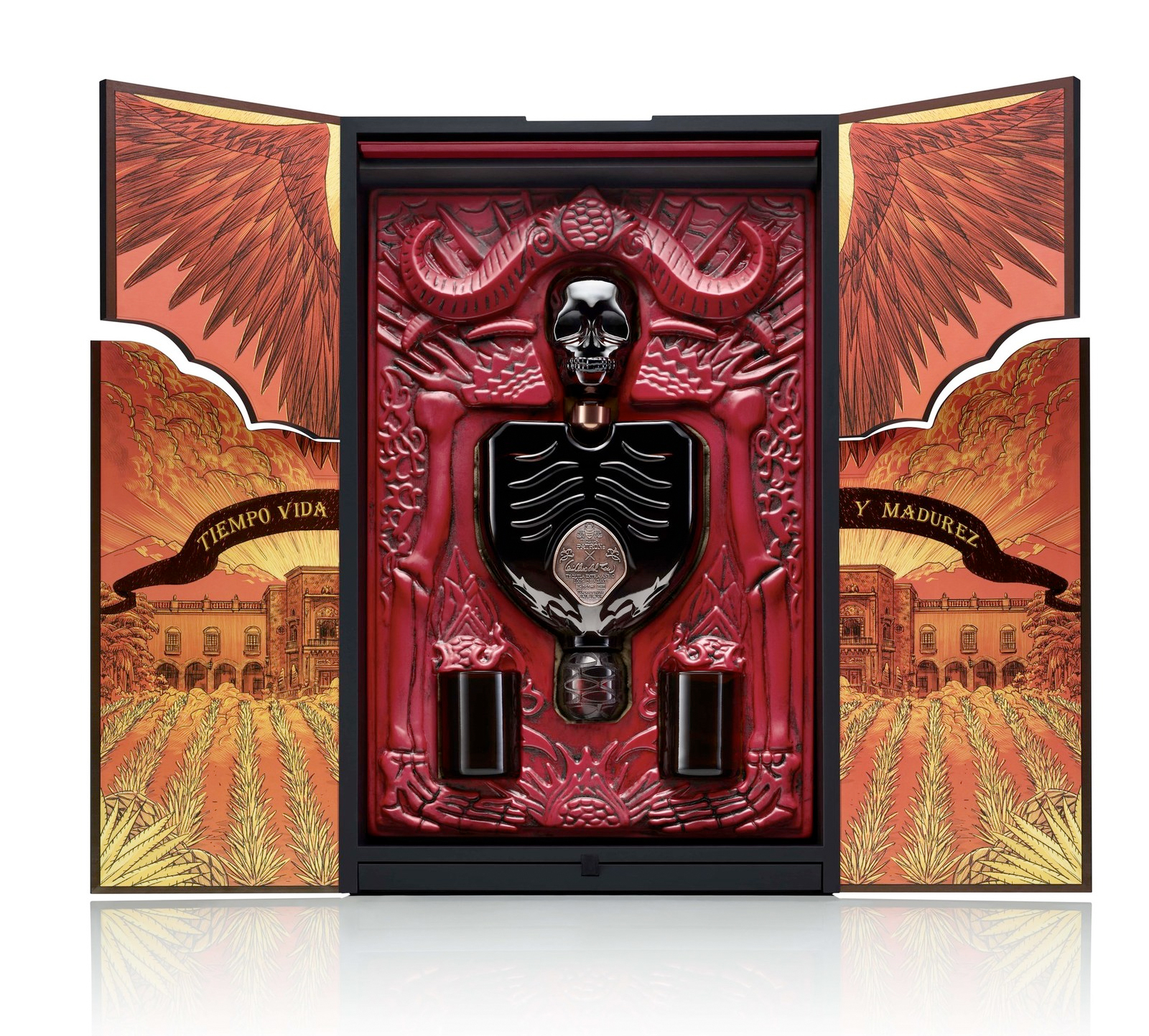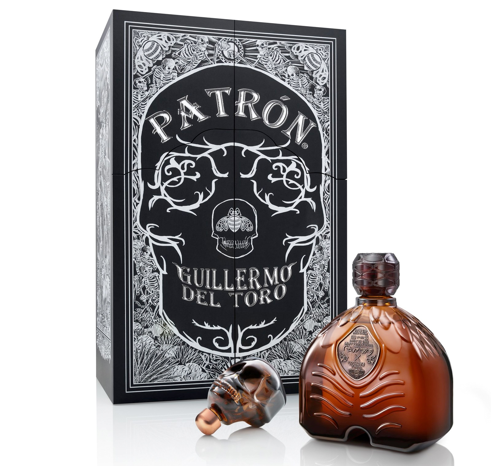 "The most striking detail inside the box is the centerpiece glass bottle, which upon closer examination reveals not one, but actually two bottles. It resembles what looks like a fantastical winged creature straight out of one of del Toro's iconic films. A limited-edition 750ml bottle of extra añejo tequila sits upside down as the "torso," while the second, a 100ml bottle of aged orange liqueur, sits on top, a skull exquisitely carved into the crystal. The spirit in the larger bottle is a remarkable blend of rare Patrón tequilas aged for an average of more than five years in a combination of different new and used oak barrels. Complementing that tequila is the smaller bottle, a first-of-its-kind aged Patrón orange liqueur produced from aged Patrón tequila."