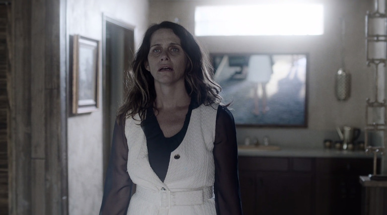 The first character we meet in "Phoenix" is not a person but a fly. The bug buzzes around Room 104, landing on curtains, motel art, and a small black and white television set that exist in another time: 1969. Once the fly finally settles, the camera slowly pans up to Joan (Amy Landecker), a shellshocked woman sitting on the edge of a bed. She's still wearing her coat and scarf. Her hands are caked in mud. And it's obvious something horrible happened to her.Joan is the sole survivor of a plane crash that's all over the news. Every passenger is presumed dead, and Joan isn't doing anything to challenge that narrative. She checked into the motel under a fake name and has not called her husband or children to say she's okay. During her stay, she's mostly been sleeping, crying, and having quiet time with the fly. But things take a turn once Liza (Mae Whitman) shows up.Joan initially thinks Liza is a housekeeper and tells her to go away. But Liza is no maid – and she knows Joan's real name. She begs Joan to let her in so she can check her vitals and give her some food. Rattled, Joan hangs up the phone on her secret lover and opens the door.Joan doesn't trust Liza, with good reason. Liza is impossibly vague about who she actually is. When Joan asks her if she's a paramedic, she says she was "once trained as a medic, yes." When Joan suspects she's a reporter trying to get a scoop, Liza merely agrees that would make sense. There's an eerie calm about her that makes her feel slightly sinister. And Liza has an edge.She somehow knows everything that happened to Joan, right down to the precise dilemma running through her head. Should Joan return to her family or begin a new life? Liza says it's time to choose, and cruelly suggests that Joan's kids would be fine without her. That's when Joan snaps, strangling Liza until she passes out. But Liza isn't dead. She merely has to go. She tells Joan to think hard about what she wants as a blinding white light from the door engulfs her. Liza vanishes, and the whole scene shifts back to the beginning, with Joan watching TV. The fly lands on her face this time. Without even blinking, she swats it dead.