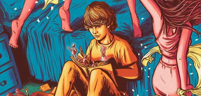The style of the print calls back to the trippy style of the 1970s, the period in which the film is set. Furthermore, it features references to several key elements and moments from Almost Famous. There's the band's bus Doris speeding across one of William's notebooks on the floor. Elsewhere there's a pop-up style image of Russell Hammond (Billy Crudup) standing on the roof of a real Topeka house claiming he's a golden god. And if you look at the record spinning on the turntable, it's "Fever Dog" by Stillwater, who is playing from the notebook that William is holding while the band-aids prepare to deflower him.