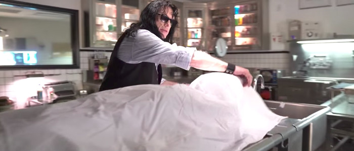 Sestero plays a bloodied, bearded homeless man named Jon who wanders the streets of Los Angeles with a series of signs that say things like, "Family Kidnaped [sic] by Ninjas. Need Money 4 Karate Lessons." Jon quickly meets an oddball mortician named Harvey (Wiseau), who spends the whole movie wearing huge platform heels and baggy parachute pants. Their very first line of dialogue speaks volumes: when Harvey pulls his hearse into his morgue lot and sees Jon watching him from outside the open gate, Harvey inquires in that specific way only Wiseau can: "Are you going to stand out there like the Statue of Liberty?"
