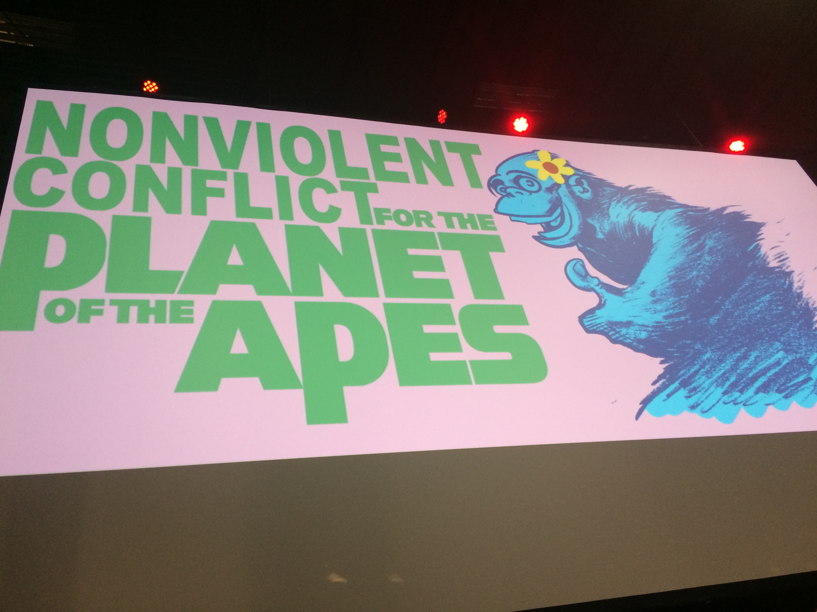 Artist Eric Powell was tasked with designing a pint glass for War for the Planet of the Apes and he took the title literally, depicting an angry Caesar armed with a rifle. When the studio sent back a note saying the image was "too violent," Powell fired off a joke version called "Nonviolent Conflict for the Planet of the Apes." Eventually, the pint glass was completed with different art.