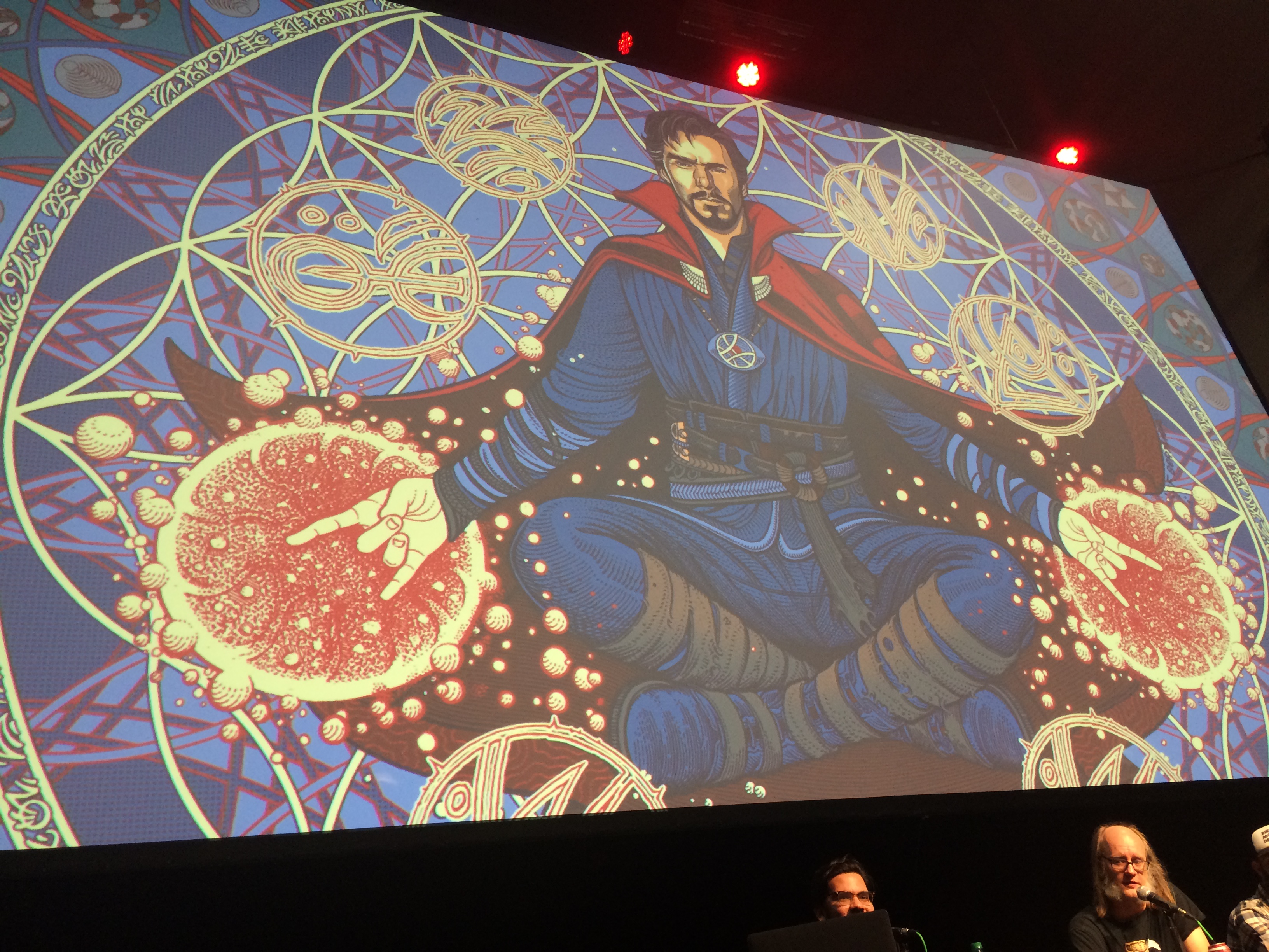 Mondo has made a poster for every Marvel Cinematic Universe movie so far...except Doctor Strange. As you can see from the art below, they certainly tried. Marvel rejected the first version because Dormammu looks significantly different in the final film and they rejected the second version because Strange never actually uses the flying lotus position in the film. The third take, a stylized depiction of the Sorcerer Supreme splintered by the mirror dimension, never got beyond this early design and Mondo hopes it can be finished one day.