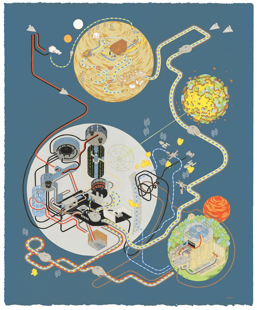 On the heels of our piece spotlighting DeGraff's work on Guardians of the Galaxy and Terminator 2: Judgment Day, some more of his Cinemaps collection has hit the internet. You can check out the whole show online here, but I wanted to share a few of my favorite pieces with you. Some are older (Paths of Dorothy from The Wizard of Oz), while some are brand new (the variants of Paths of Hope inspired by the original Star Wars and Paths of Crusade inspired by Indiana Jones and the Last Crusade):