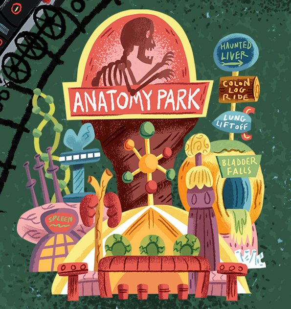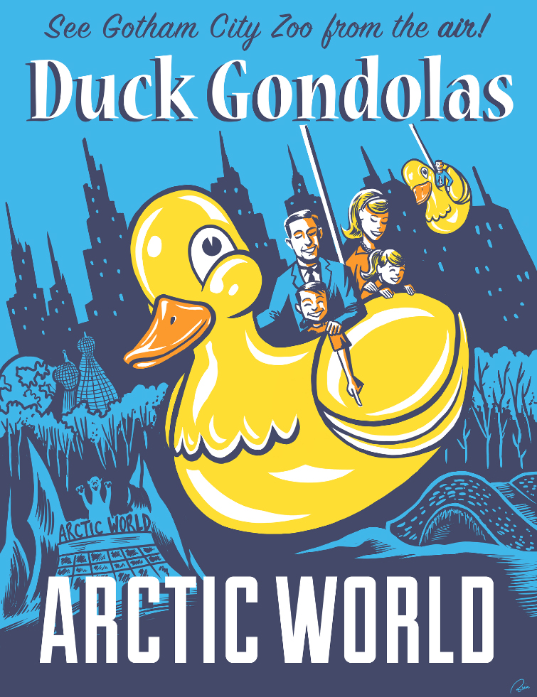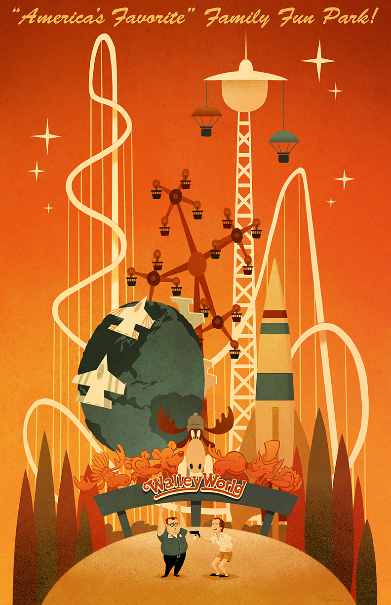 First up, see if you can pinpoint all the parks are from on this Fake Theme Parks art show poster by Luke Flowers: