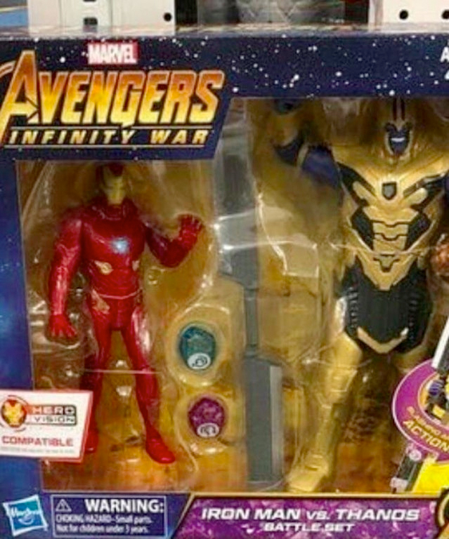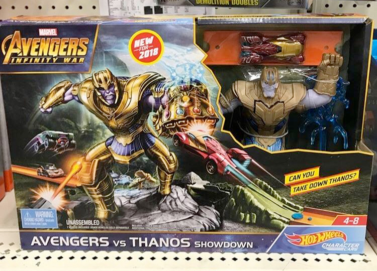 As you can see, the illustration on the Hot Wheels set not only promises an insane crossover between Marvel and the Fast and Furious franchise, but it also features Thanos in his full battle armor. The figure included with that toy set also follows suit. Meanwhile, the other toy is an action figure set that has Thanos packaged with Iron Man, and he's wearing the same full armor in that package, too.