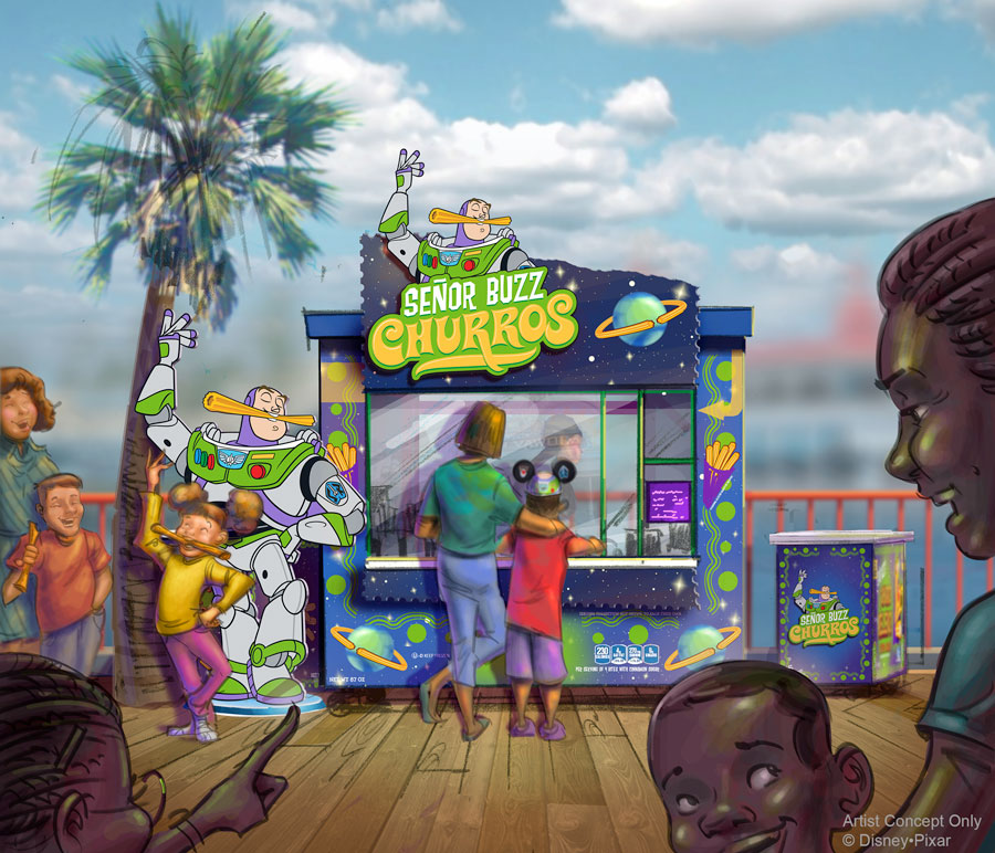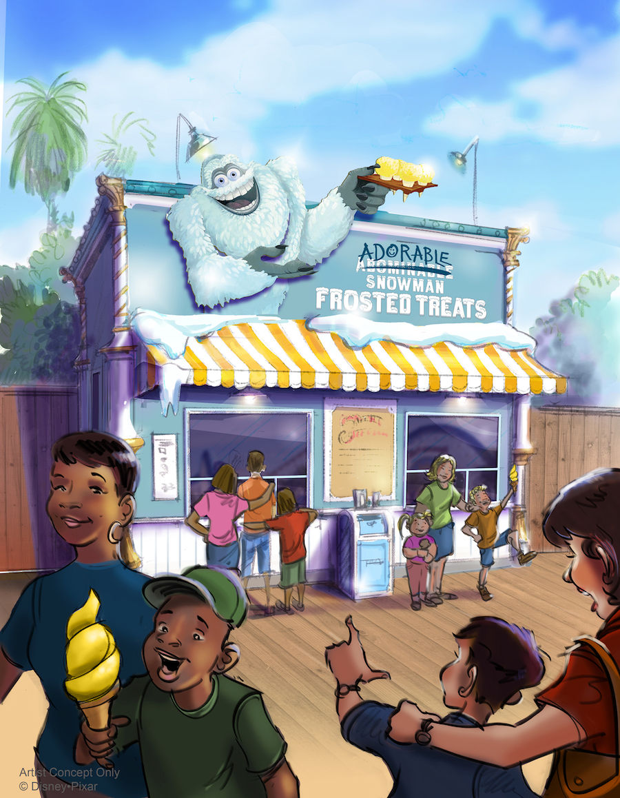 Here's arguably the most important info: the new snacks that will be available as soon as Pixar Pier opens to the public. There's the Monsters, Inc.-themed Adorable Snowman Frosted Treats, where employees will try to sell you pee-colored delights on warm days. Tasty! Poultry Palace is based on a Pixar short I'd never seen called Toy Story Toon: Small Fry. (You can watch the short right here if you've also never seen it.) Churros have become a staple of any Disney trip, and soon you'll able to pick one up at Señor Buzz Churros, themed after the time Buzz Lightyear was switched to Spanish mode in Toy Story 3. And it looks like the flames produced by Inside Out's Anger are being put to good use at a hot dog stand called Angry Dogs.