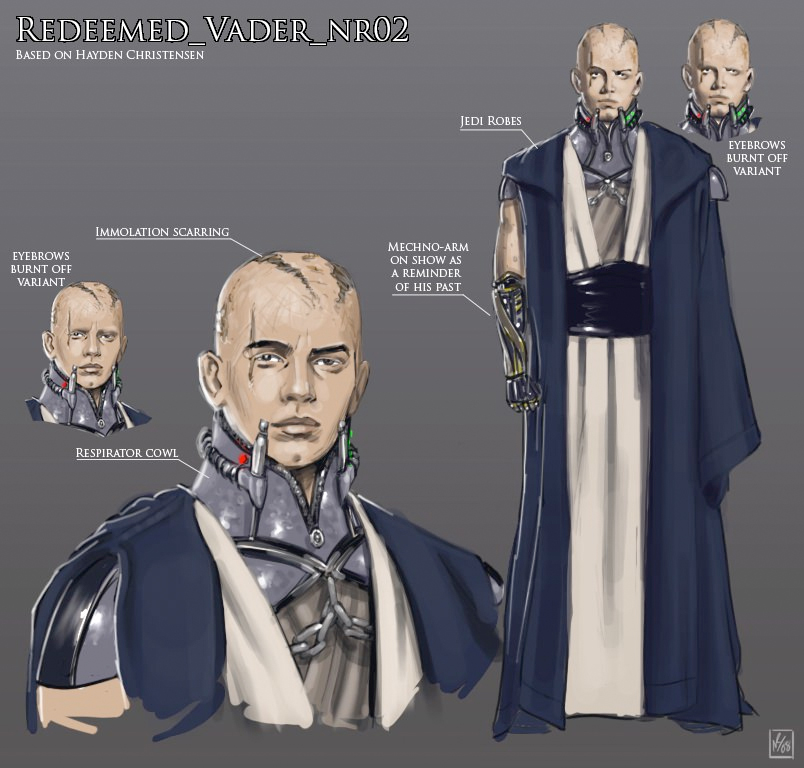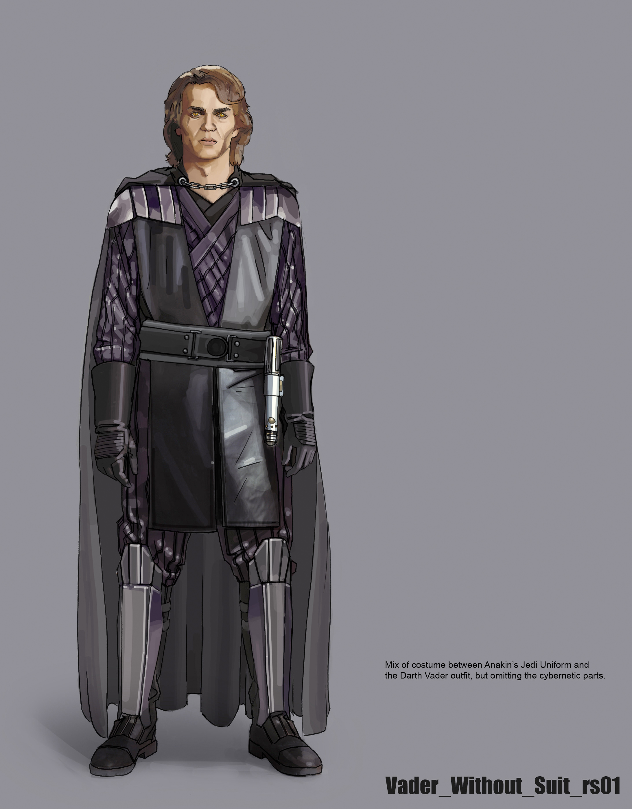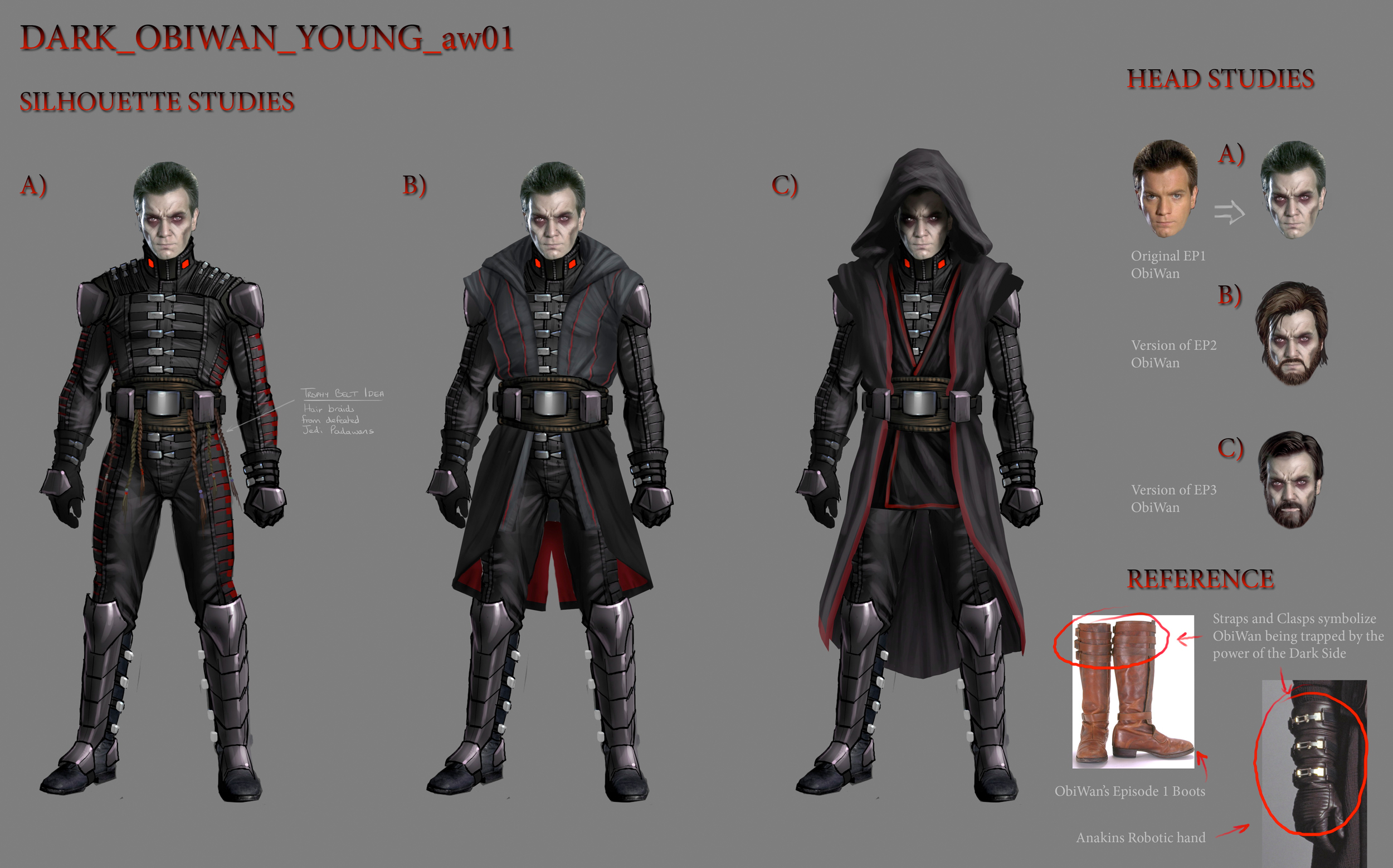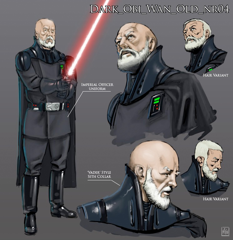 As you can see, there are also pieces of concept art imagining an older version of dark side Obi-Wan Kenobi. One of them gives him a mix of wardrobe choices from a uniform that looks like an Imperial officer to an armor neck and shoulder piece that resembles Darth Vader. The other version is a bit more drastic in design, making him look like dark side version of Obi-Wan who has seen better days. His clothes are all tattered, he almost resembles Darth Vader as he looked under the helmet in Return of the Jedi.