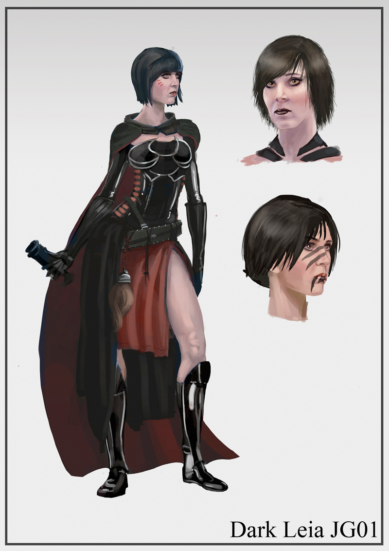 It would appear that maybe Leia ends up being raised by Anakin Skywalker instead of Bail Organa. As you can see, this is a younger looking Leia who has been trained in the dark side. Some of the designs give her red and black armor, while one opts for gold instead. Another is clearly influenced by her slave outfit from Return of the Jedi, but I can't imagine that would have flown too well.