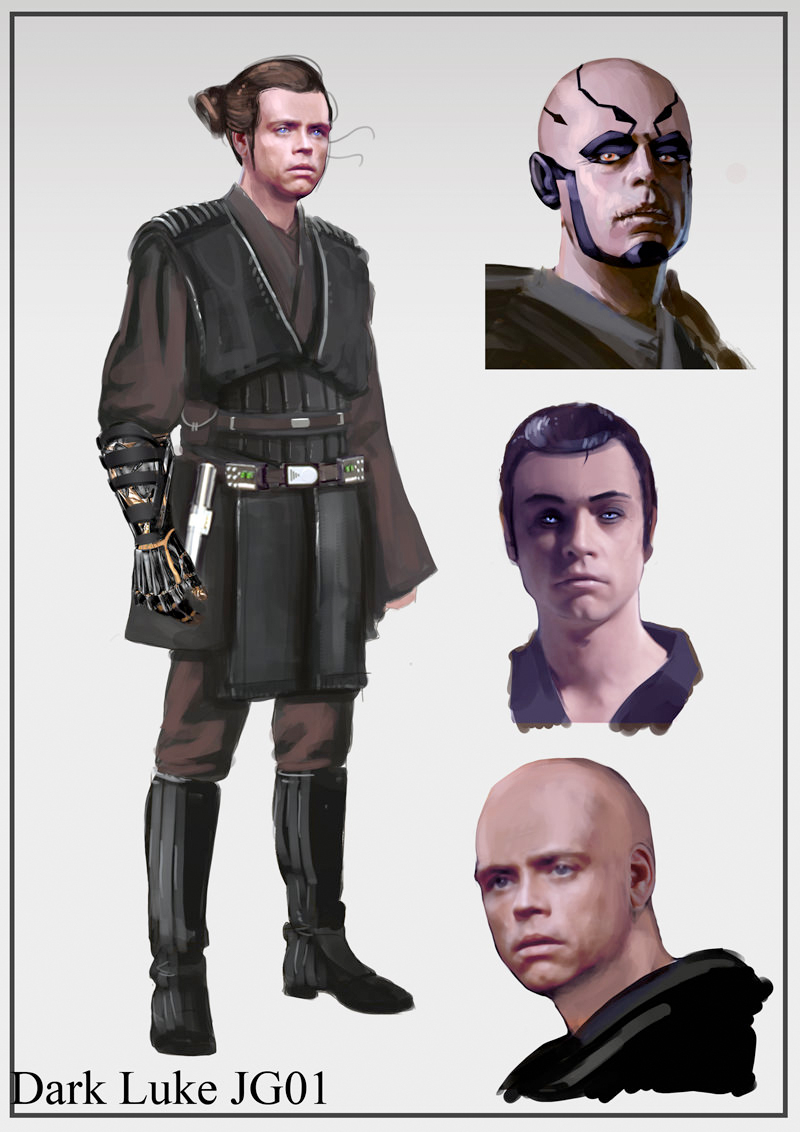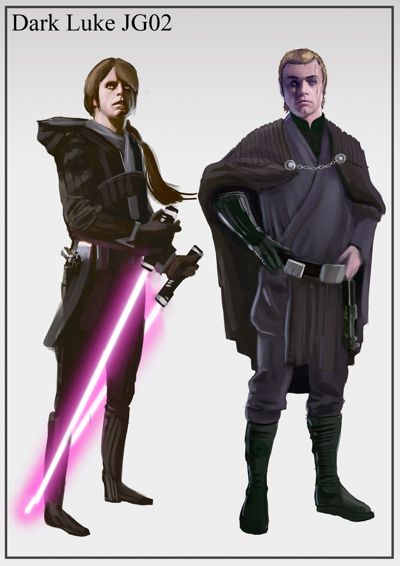 As you can see, Luke could have gotten a pretty drastic makeover. He's even given two purple lightsabers, perhaps a nod to his Expanded Universe wife Mara Jade, who also carried a purple lightsaber.