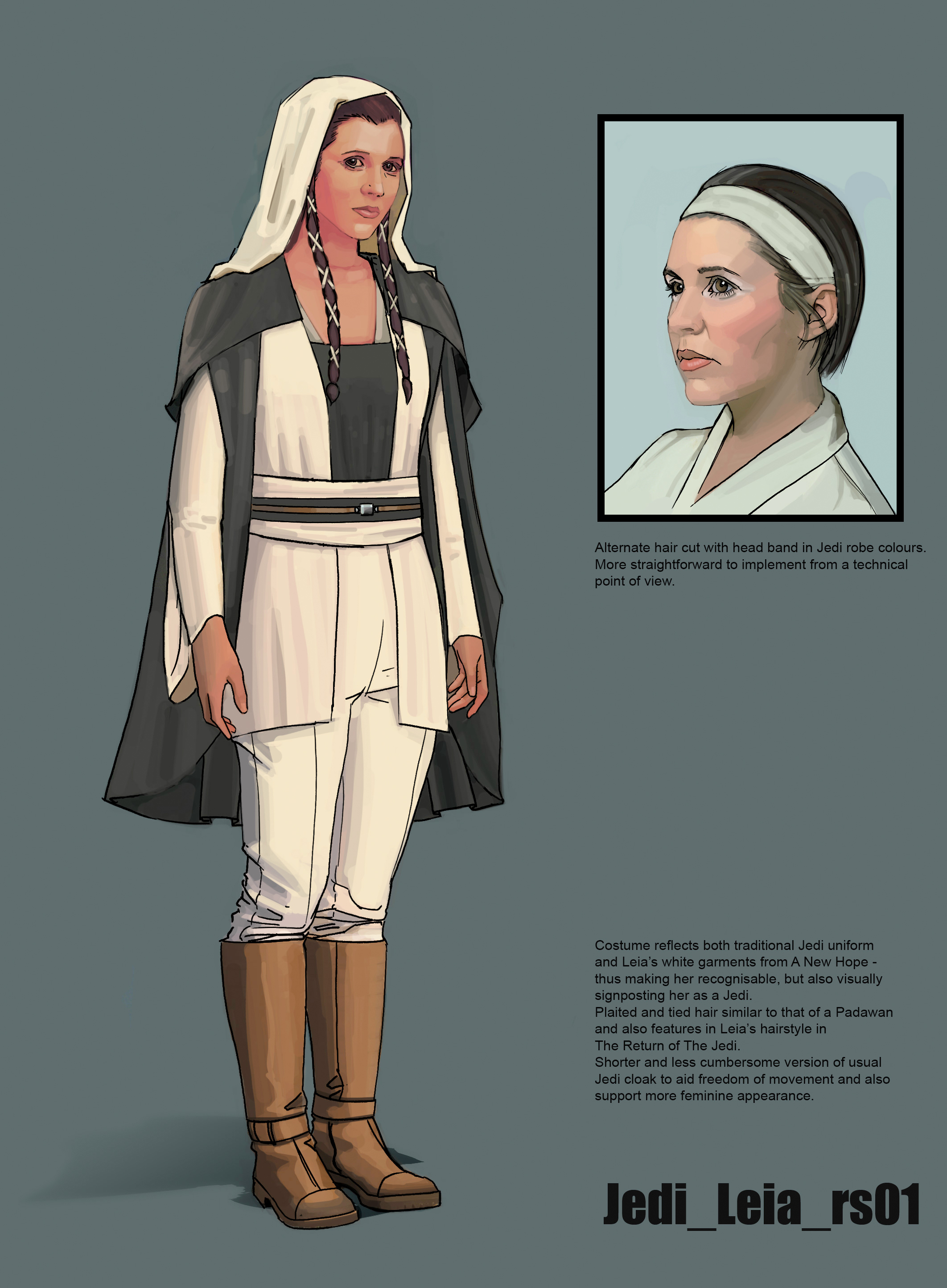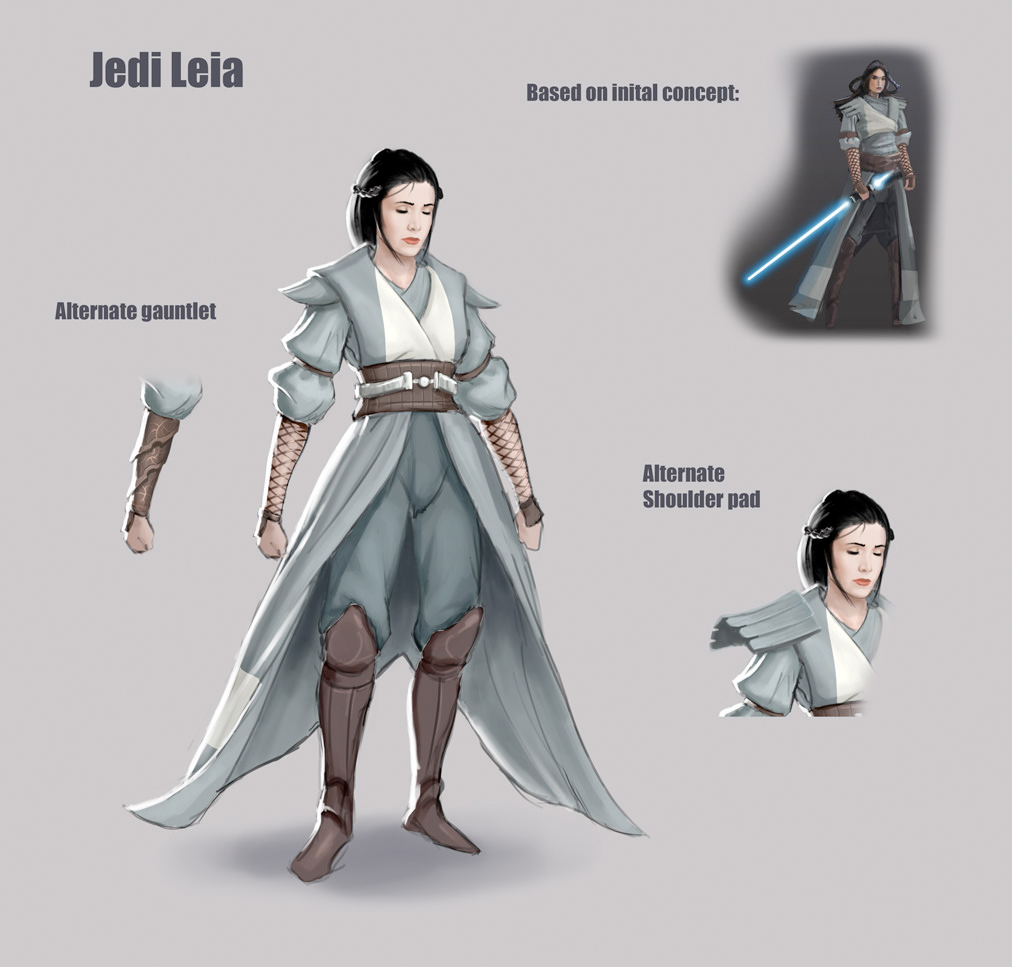 It would appear that Leia turns to the light side with her father, since there are Jedi versions of Leia in the concept art as well. There are clearly some influences from her look in Return of the Jedi, especially her hair on the left. Meanwhile, the image on the right almost looks like it could be a design used for Rey in the next installment of the new Star Wars trilogy.