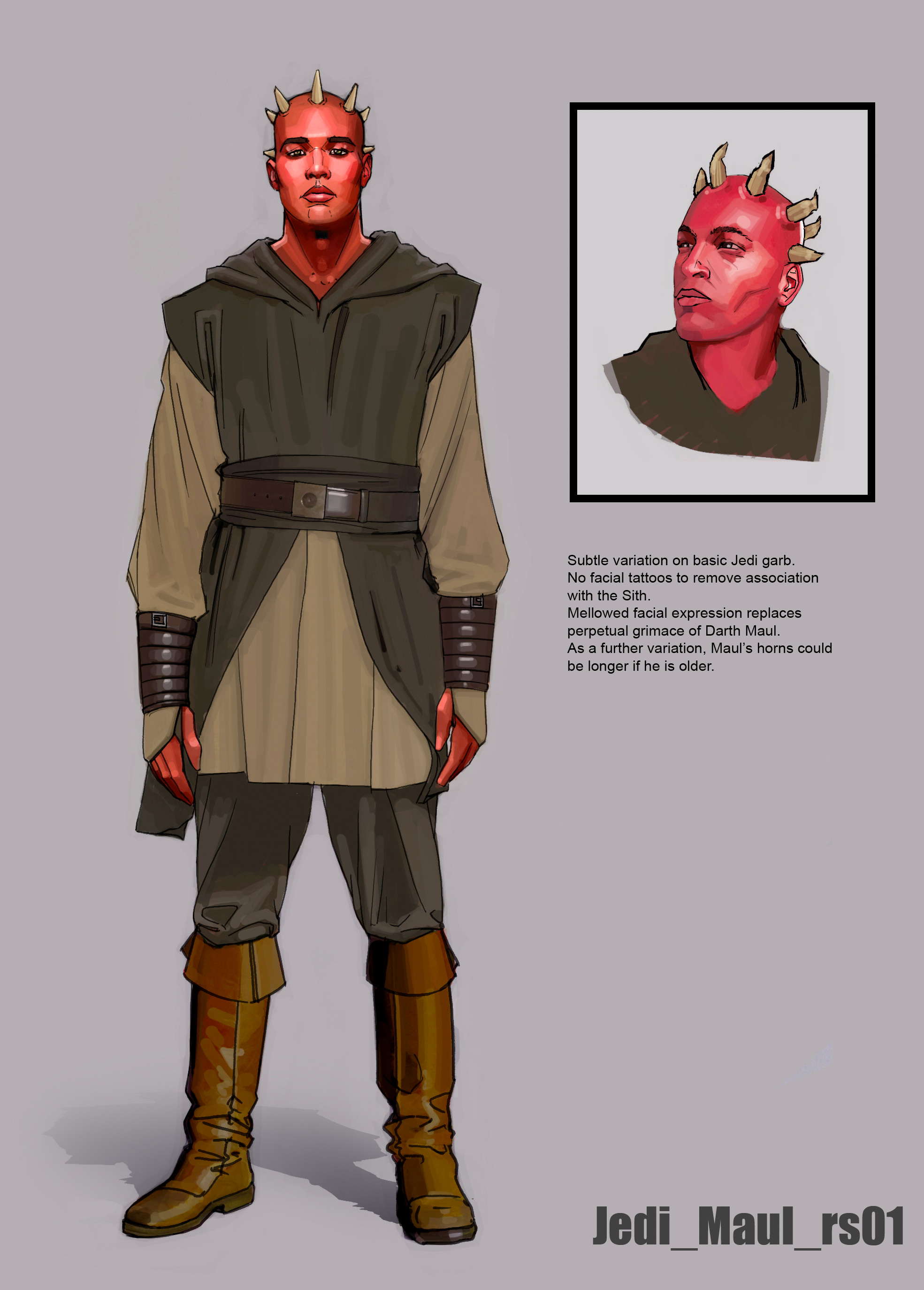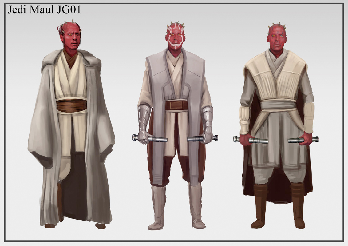 Darth Maul gets a drastic makeover, too. He also looks considerably younger and nothing like Ray Park. I wonder if he was intended to be the young apprentice of Count Dooku, perhaps a stand-in for a lack of Anakin Skywalker As you can see, he's missing his black facial tattoos, but still has the horns. The designs on the right feature different variations with his hair and horns, as well as one with white facial tattoos. His double bladed lightsaber has also been traded in for two separate lightsabers.