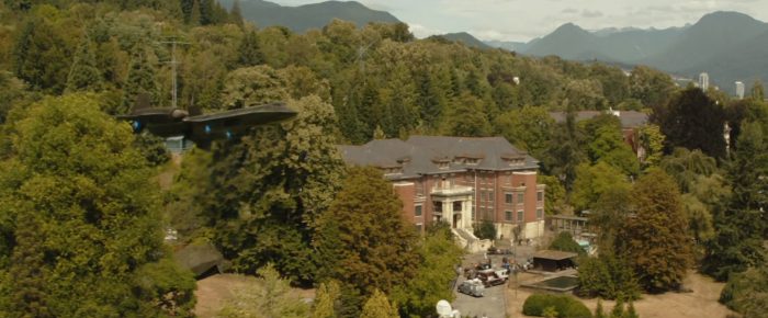 Where is this shot? We're not sure what the location is, but if you look at the front of the building where the staircase is, that appears to be the same location where Deadpool is standing in his gray and black (or dirty) suit along with Negasonic Teenage Warhead. Clearly the X-Men's jet brings her to this scene, but we're not entirely sure why.