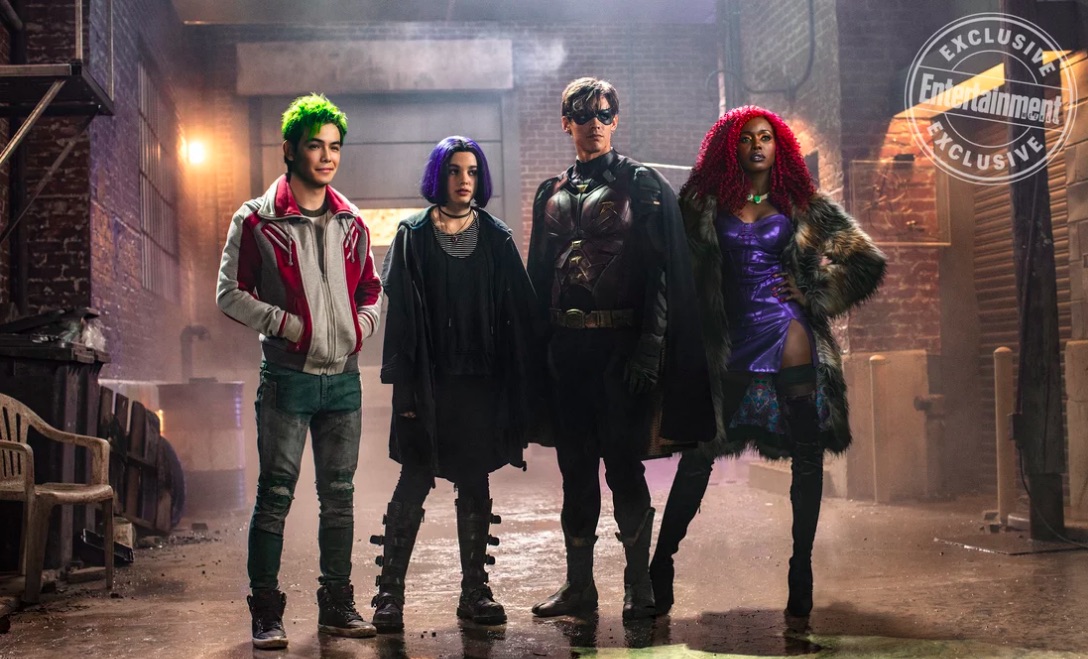 Three brand new Titans images have debuted today, courtesy of Entertainment Weekly and IGN. The first image from EW shows the (no longer teen) team all together: Robin/Dick Grayson (Thwaites), Raven/Rachel Roth (Teagan Croft), Starfire/Koriand'r (Anna Diop), and Beast Boy/Gar Logan (Ryan Potter). The four of them pose in front of a garishly lit alleyway set that either looks like a discarded Rent set or an Escape Room.