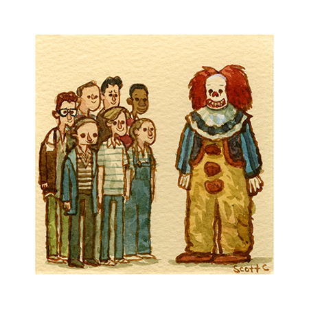 The artist and illustrator released five new Great Showdown prints which depict iconic characters from beloved horror or Halloween-themed movies, including An American Werewolf in London, Stephen King's It, Hocus Pocus, Sleepy Hollow, and Child's Play, each boasting a simple title like "The Werewolf" or "The Clown." See the five new Scott C Halloween prints below.