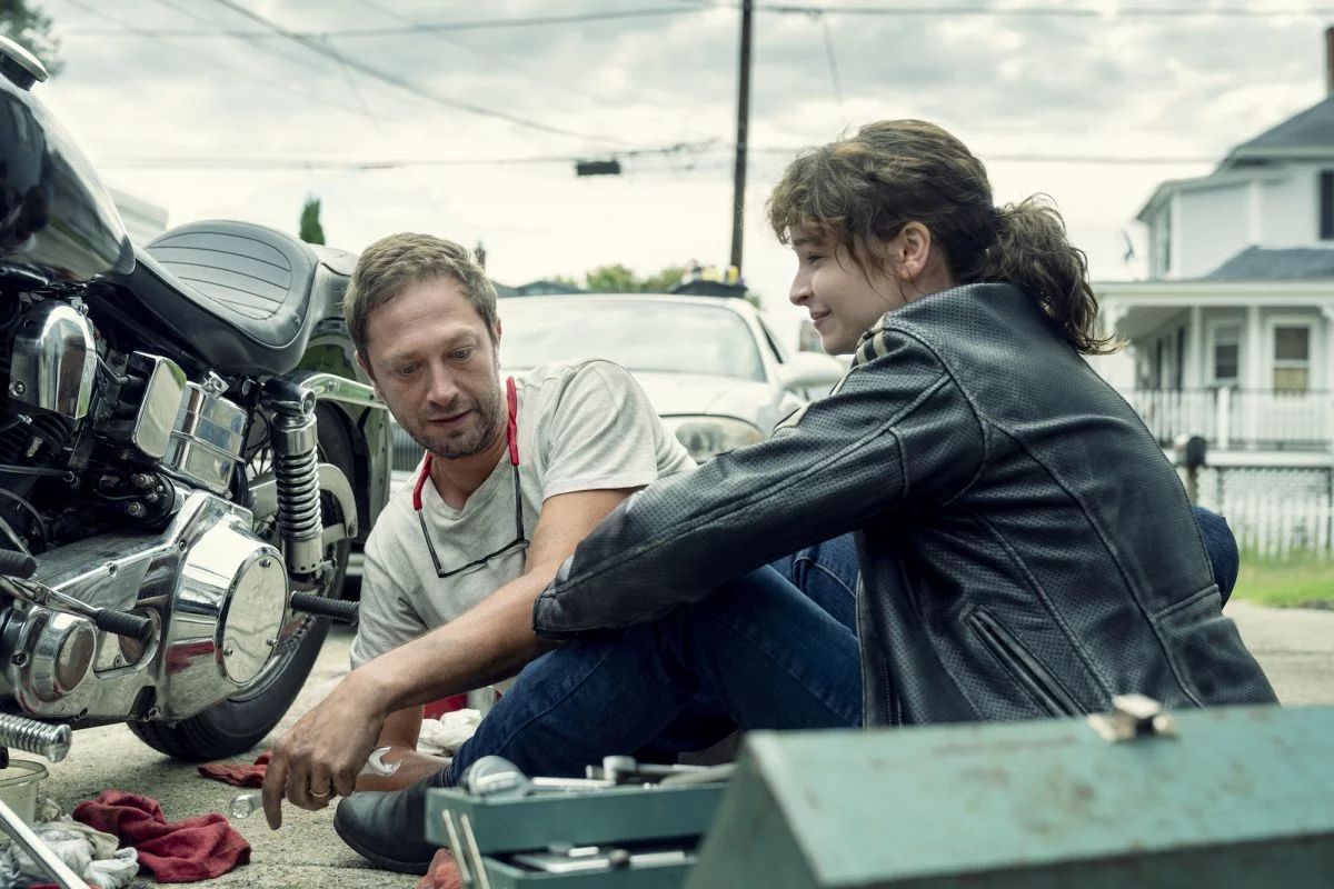 Here, Vic is seen with her father Chris (Ebon Moss-Bachrach). Vic is estranged from her father in the book, and this image is likely from some sort of flashback.