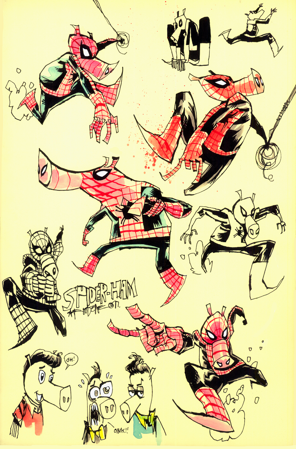 Mulaney, for his part, seems delighted to just have his name associated with a superhero movie, cracking jokes about the unglamorous life of a comedian. But though Mulaney has little prior acting experience to Into the Spider-Verse, I think it's fair to say that he knocks it out of the park. And if there were to be a Spider-Ham spin-off, I'd be first in line. For now, we'll have to satisfy ourselves with this concept art of Spider-Ham, who underwent some major changes from conception to realization.