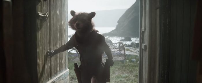 Once the time heist is being set up, the whole team needs to be reunited. Rocket Raccoon and Hulk are tasked with going to get Thor, who is holed up in a cabin in New Asgard. We get a shot in one of the trailers of Rocket walking into Thor's cabin, but the final shot in the movie also features Hulk behind him peeking into the door. But he's been removed from the shot entirely.