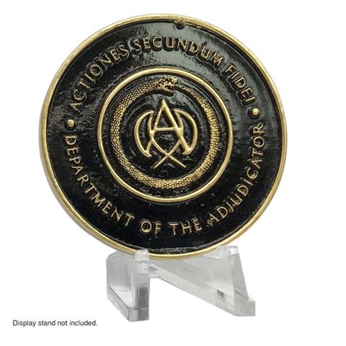 Meanwhile, the Adjudicator's Medallion is recreated from the screen-used prop and cast from the finest materials. The medallion's blackened surface features a golden Ouroboros surrounding the seal of the Department of Adjudicators, with the Latin precept, "Actiones secundum fidei" emblazoned above it. Try to flash it around New York City and see if it gets you anywhere. It'll cost you $39.99 and is expected to ship sometime in the third quarter this year.