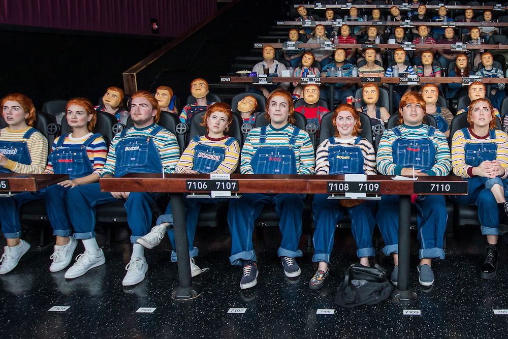 Orion Pictures invited Child's Play fans to attend an early screening of the film "in your best striped shirt and denim for your best Chucky look" for a special cosplay event ahead of the remake's wide release at the Alamo Drafthouse South Lamar theater in Austin, Texas. "Come meet your new best friend" the invitation cheerily describes, not quite capturing the creepiness that comes with sitting next to dozens of people wearing the exact same red wig, overalls, and striped shirts as you. Masks were also provided at the screening, adding an extra layer of horror. But, like Batman has found out, there's no better way to confront your greatest fear than to dress as it.