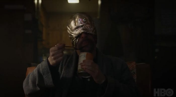 As Hooded Justice is giving his answer, we cut to the living room of Looking Glass, the masked cop played by Tim Blake Nelson. Here there's a direct visual callback to the Watchmen comic, as Looking Glass sits with his mask rolled up over his nose, spooning food (presumably beans) from a can into his mouth.