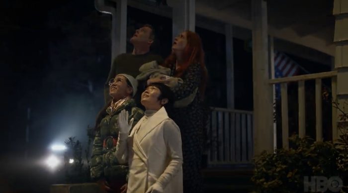 Then we see a meteorite falling to Earth behind a barn. Is this Dr. Manhattan landing on the farm? People on a front porch look to the heavens as if they're watching it.