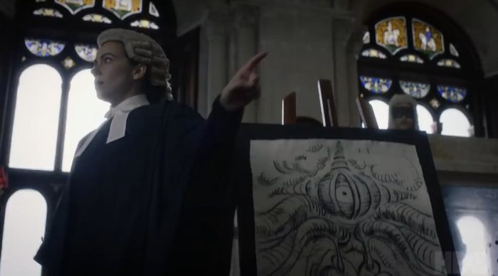 A quick glimpse of a courtroom with an exact sketch of the alien squid monster from the comics would seem to solidify this show as taking place in that universe. Is this Veidt's trial? The courtroom appears to be in England, as the barrister, who points an accusing finger at someone, is wearing a white wig, or peruke, of the kind still in use there.