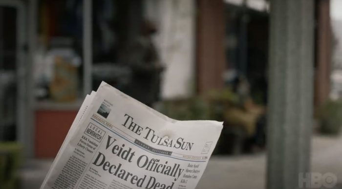 As she's espousing this Manichaean philosophy, we see her walking the streets and a succession of images provides more links to the characters from the Watchmen comic. A front-page Tulsa Sun headline (note that we're in Oklahoma) reads, "Veidt Officially Declared Dead." This is a reference to Adrien Veidt, AKA Ozymandias, the former superhero whose genocidal conspiracy to unite the world under the fear of alien invasion was revealed in Watchmen's climax.